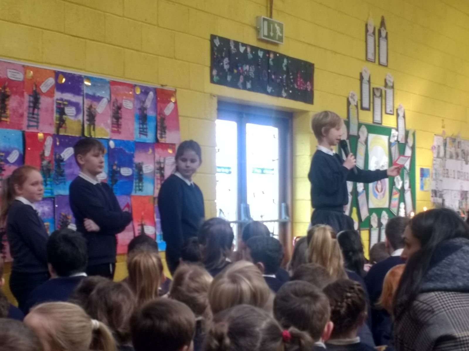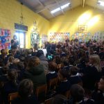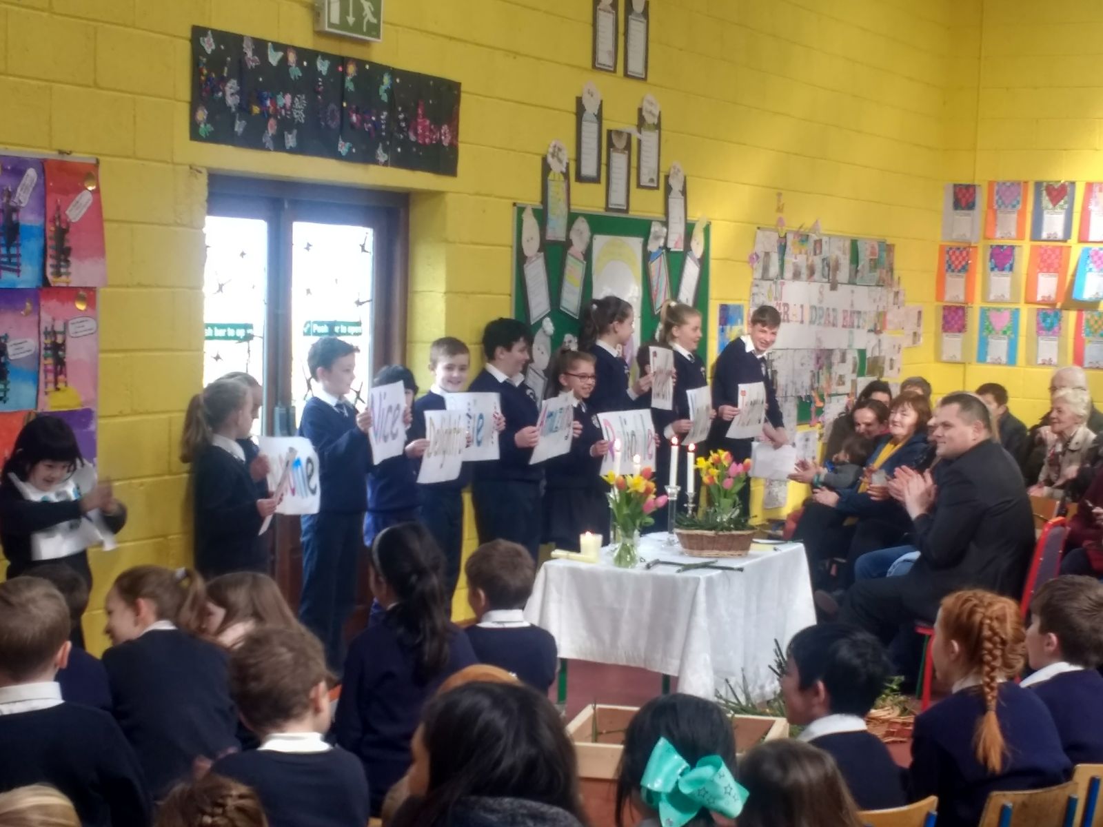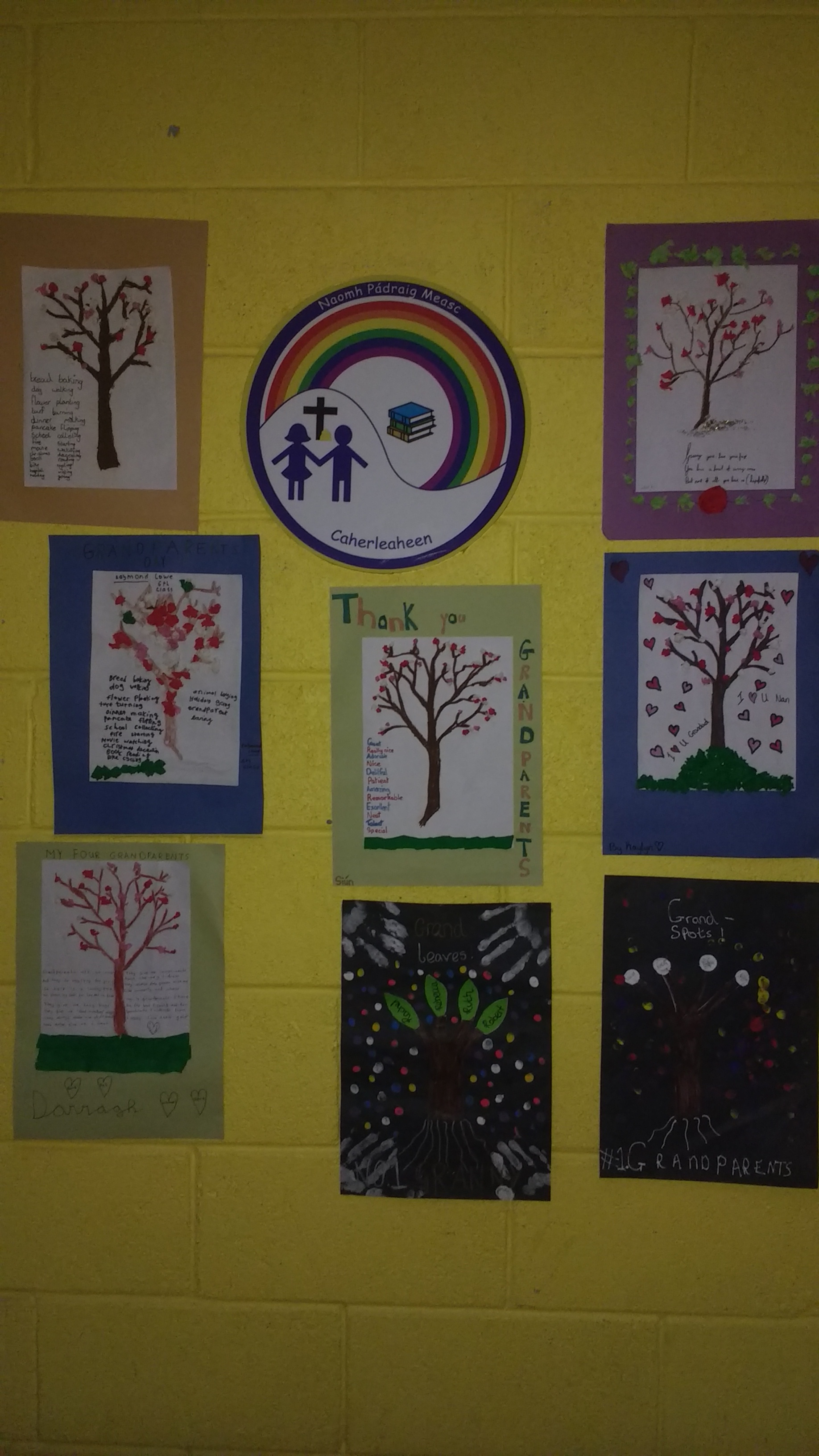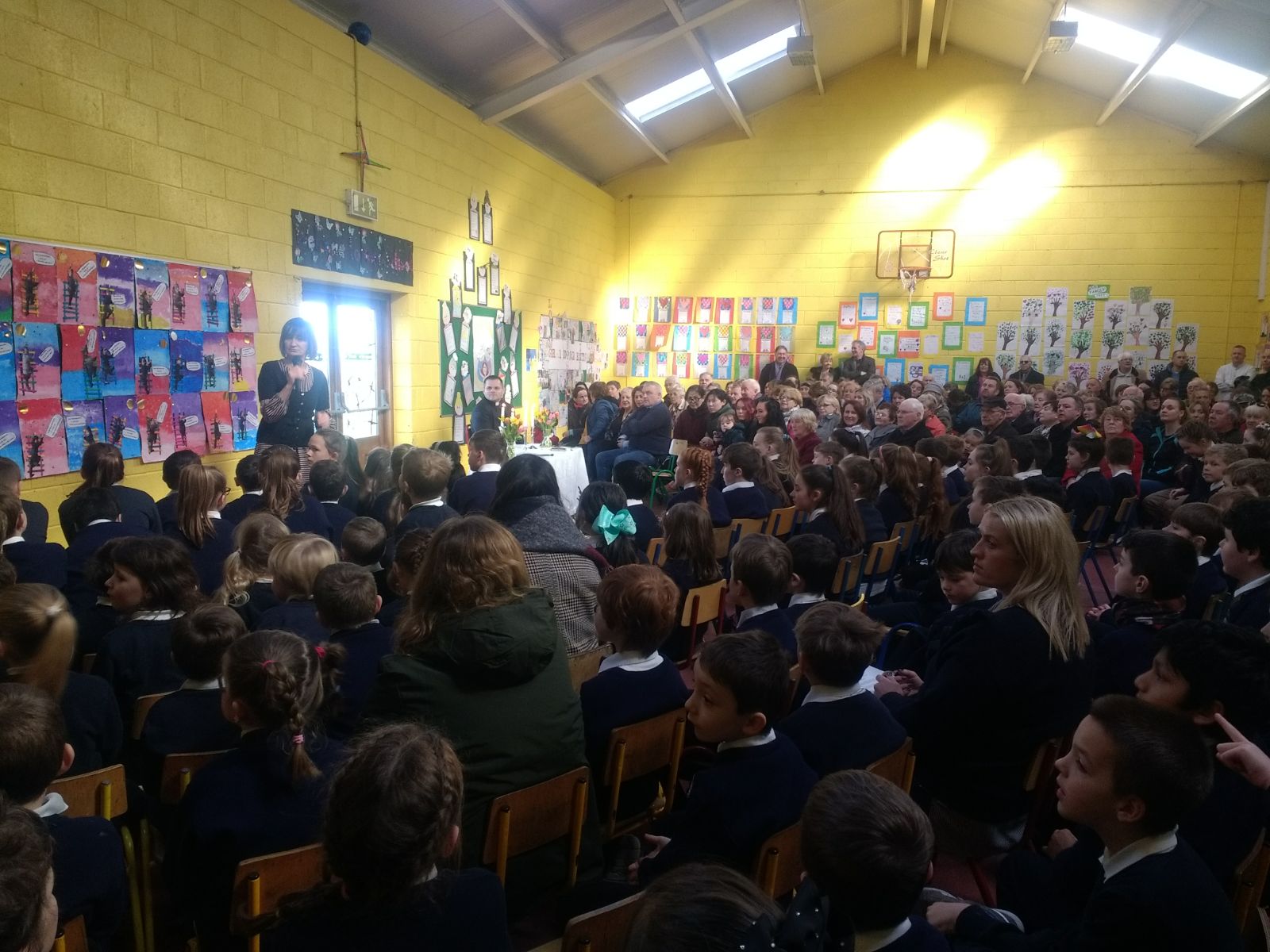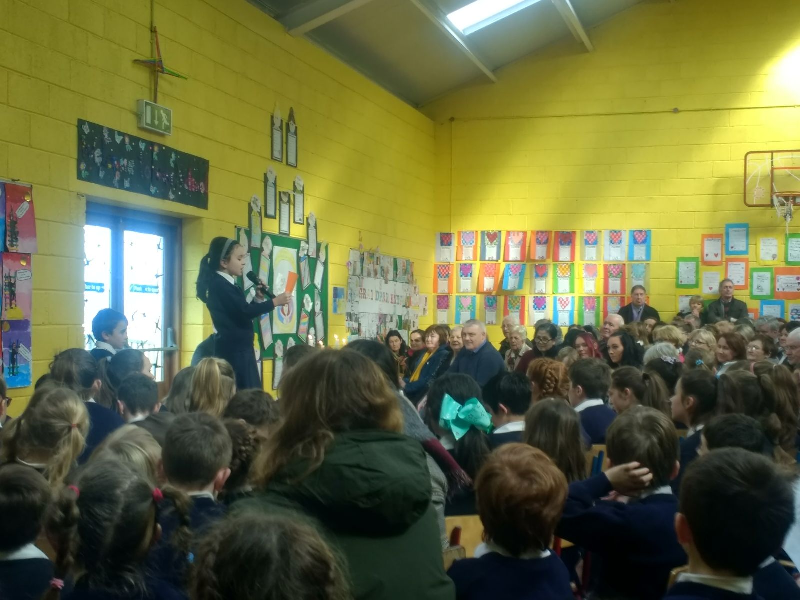 Our Grandparents and parents arrived in their droves;some had travelled from other counties. The excitement was palpable and barely containable as we filled the hall, yet ALL the children made us so proud. A mass St Blaise blessing of our throats, by Fr Poitr and hundreds of St Brigid Crosses reminded us of how blessed we all are!Click ‘Read More’ for pics. The songs and prayers were very well received, as were the teas and scones baked by Third Class. I really want to thank Sixth Class for welcoming our VIPs so warmly, the Fifth Class group who cleaned and dried the red chairs during their breaks,our LS teachers for serving ( and adorning) so many scones and teas, Fr Poitr for welcoming our Polish visitors and all, Noreen, Caroline and Carol (our hardworking parents), SNAs for magically clearing and restoring equipment in hall, the kids for their wonderful art and poems, the teachers for their motivation and ‘can do’ attitude, Ms Claire for pulling it all together and again…. the kids! Lastly,👍to all our grannies, granddads and parents (your presence and support means alot to staff and children). Míle buíochas daoibh go léir.